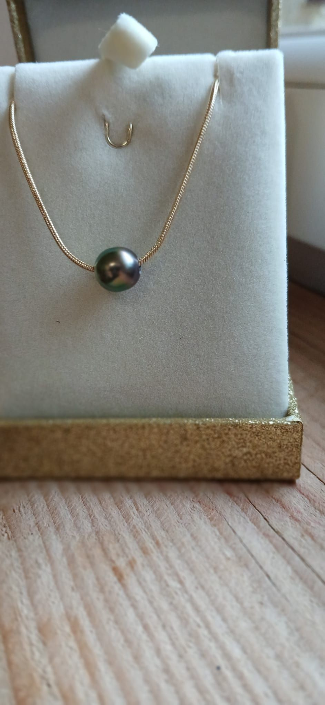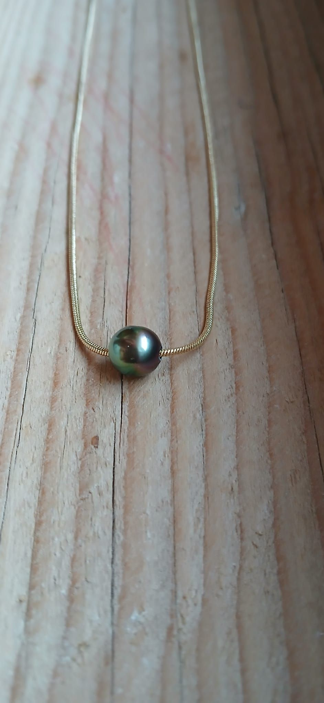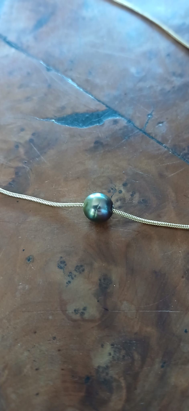 Tour de cou composée d'une chaîne serpentine en laiton dorée à l'or fin, mettant en valeur une jolie perle de Tahiti, grise.